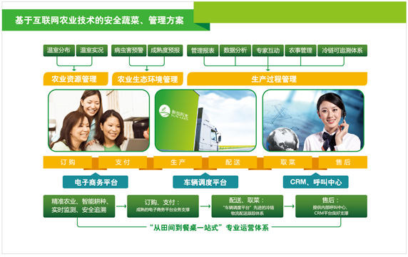 新苑的智慧农业云平台,集合了20多个应用子系统,利用物联网、云计算、移动服务、数据融合等先进技术用于对农业生产管理、加工配送、精确营销等信息统筹管理,通过农业云平台的信息共享与集中处理,完成全产业链多角色的高效协同工作,针对农业生产的每一个环节进行跟踪,监控与管理,同时经过长时间的数据沉淀,实现农业大数据分析反哺生产,实现种苗、技术、农资、回收、销售的五统一管理。